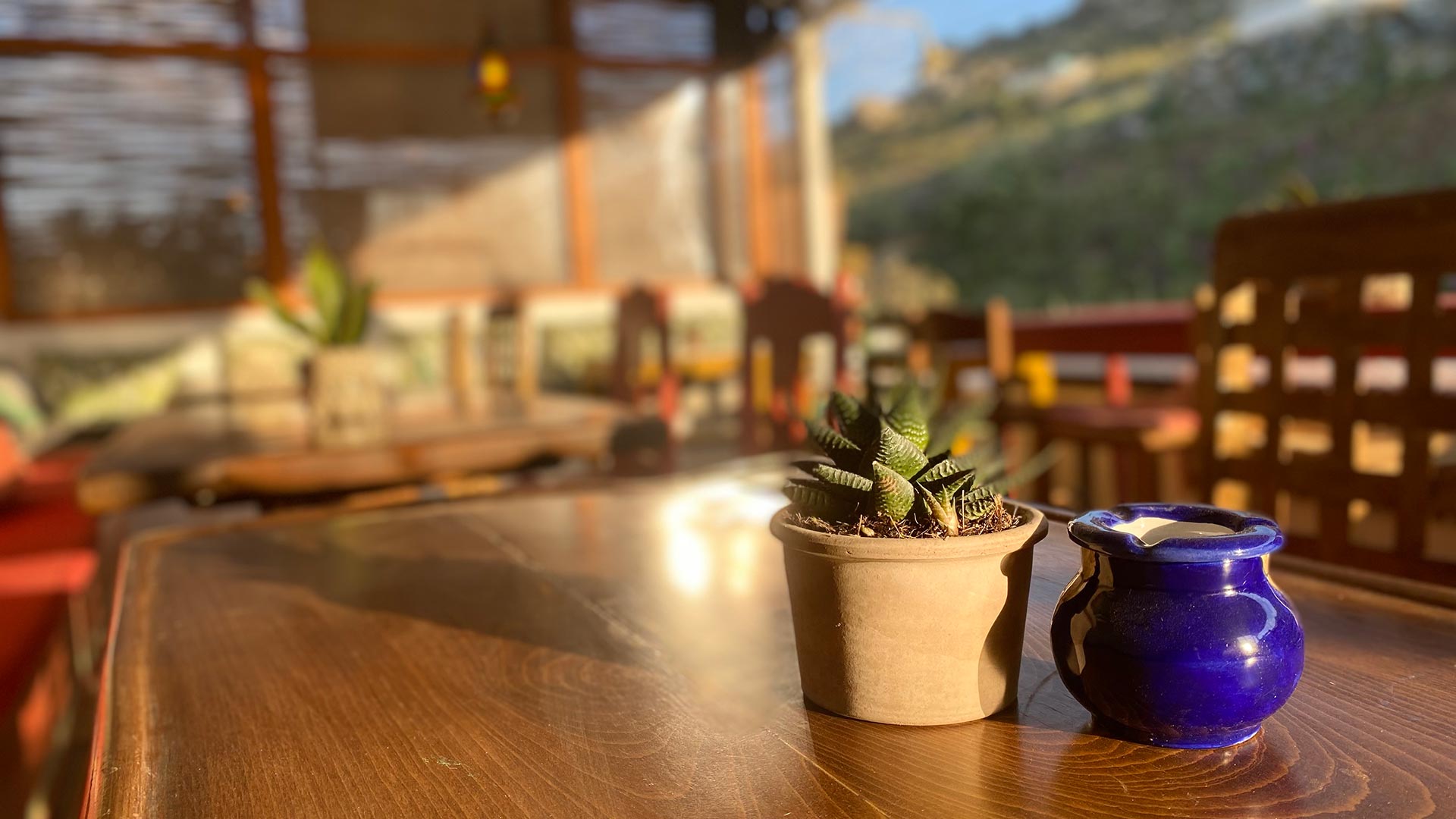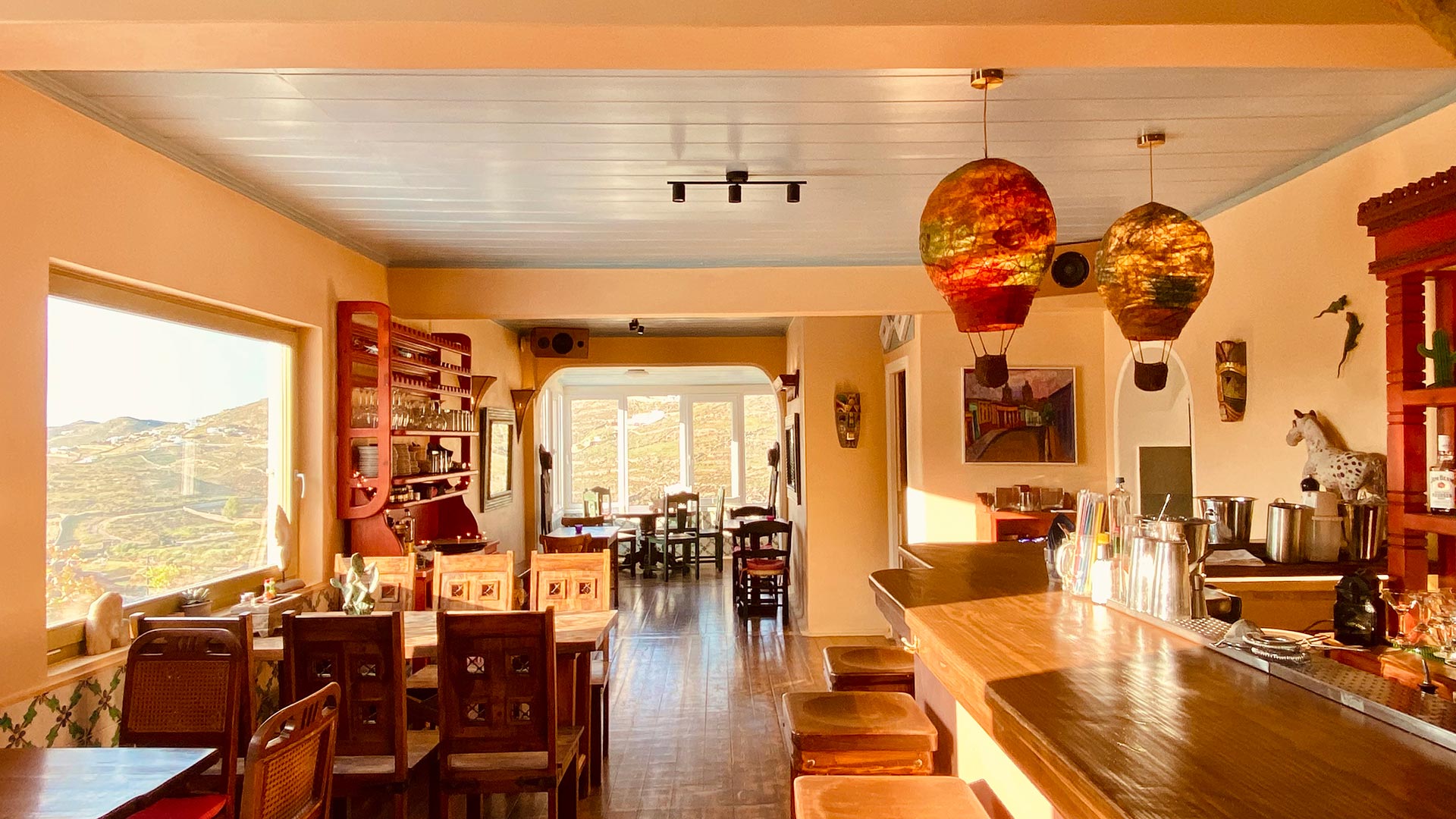 After 27 years in Mykonos town we have now moved to our new location on Ano Mera road (ex- Kuzina di Danielle), with a beautiful view of both Ftelia Beach and the Mykonos countryside.